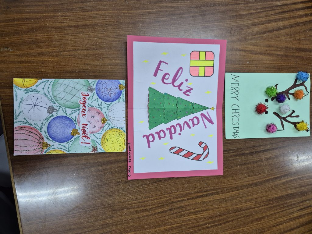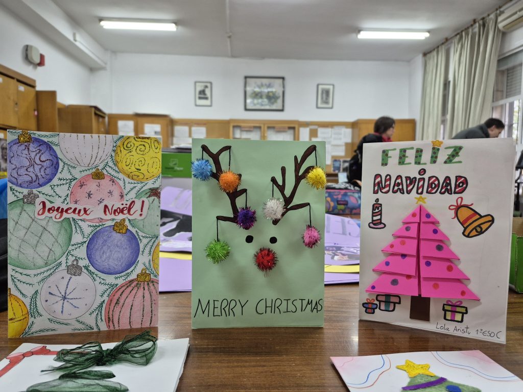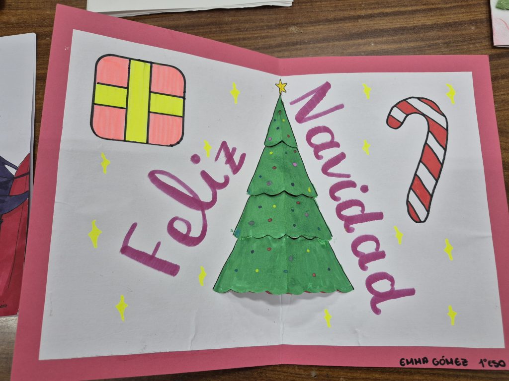 Durante las últimas semanas de noviembre el alumnado de 1º de ESO del IES Velazquez ha elaborado postales navideñas para felicitar estas fiestas. Esta iniciativa, fruto de la colaboración del Dpto. de EPVA, el Proyecto Escuela de Paz y el Proyecto Bilingüe ha dado como resultado la creación de un fantástico número de felicitaciones que han hecho la labor del jurado realmente difícil. Enhorabuena a Kira Zabala de 1 ESO C por su preciosa postal en francés. Os mostramos también a continuación algunos otros ejemplos: